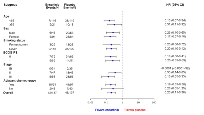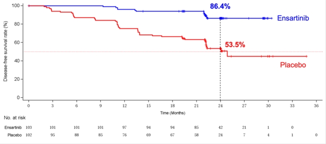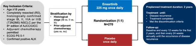 受试者按1:1随机接受恩沙替尼(225 mg QD)或安慰剂治疗2年或2年内疾病复发或达到其他终止治疗的标准,随机分组根据术后肿瘤分期(IB期 vs II期 vs III期)和是否接受辅助化疗(是 vs 否)为分层因素。