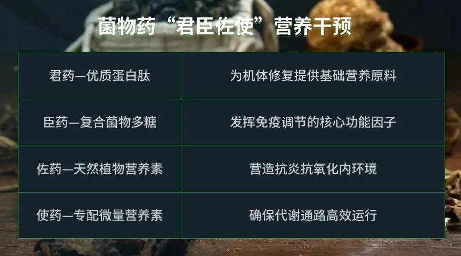 “肿瘤全周期免疫干预、营养支持、健康管理” 项目的核心亮点在于将传统 “君臣佐使” 系统化营养干预理论与现代生物医学技术深度融合,基于菌物活性成分的生物调控特性,通过多组学整合分析和系统生物学等方法,成功建立了完整化的精准配伍体系。即:以优质蛋白肽为“君药”,作为机体修复提供基础营养原料;以复合菌物多糖为"臣药",作为功能因子发挥免疫调节的核心功能;以天然植物营养素作为"佐药",营造抗炎抗氧化内环境;最后,以科学配比的微量营养素作为"使药",来确保代谢通路的高效运行。